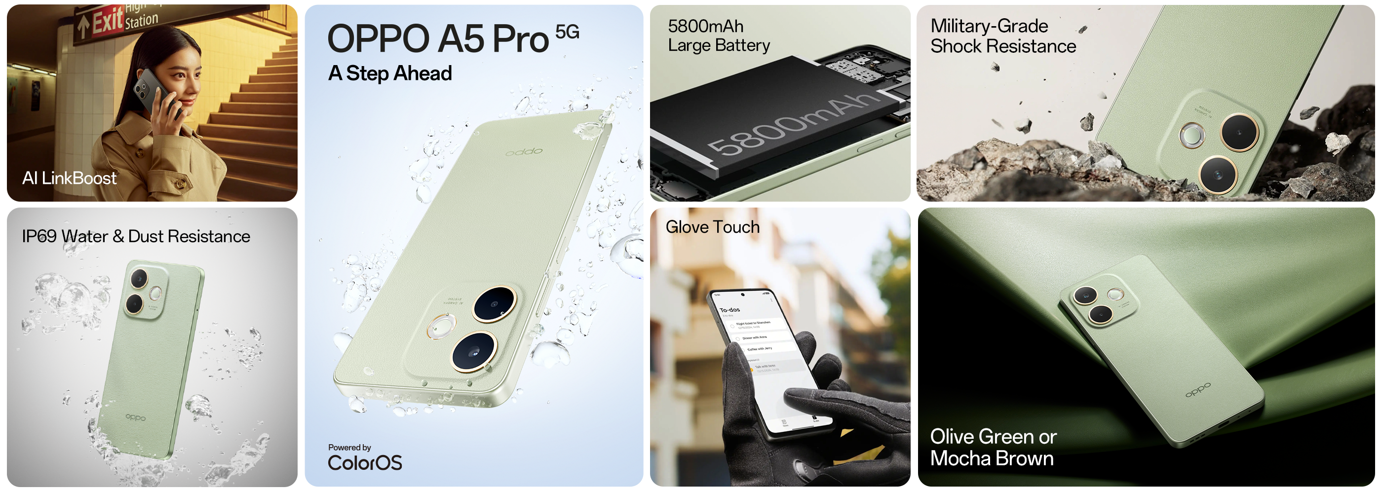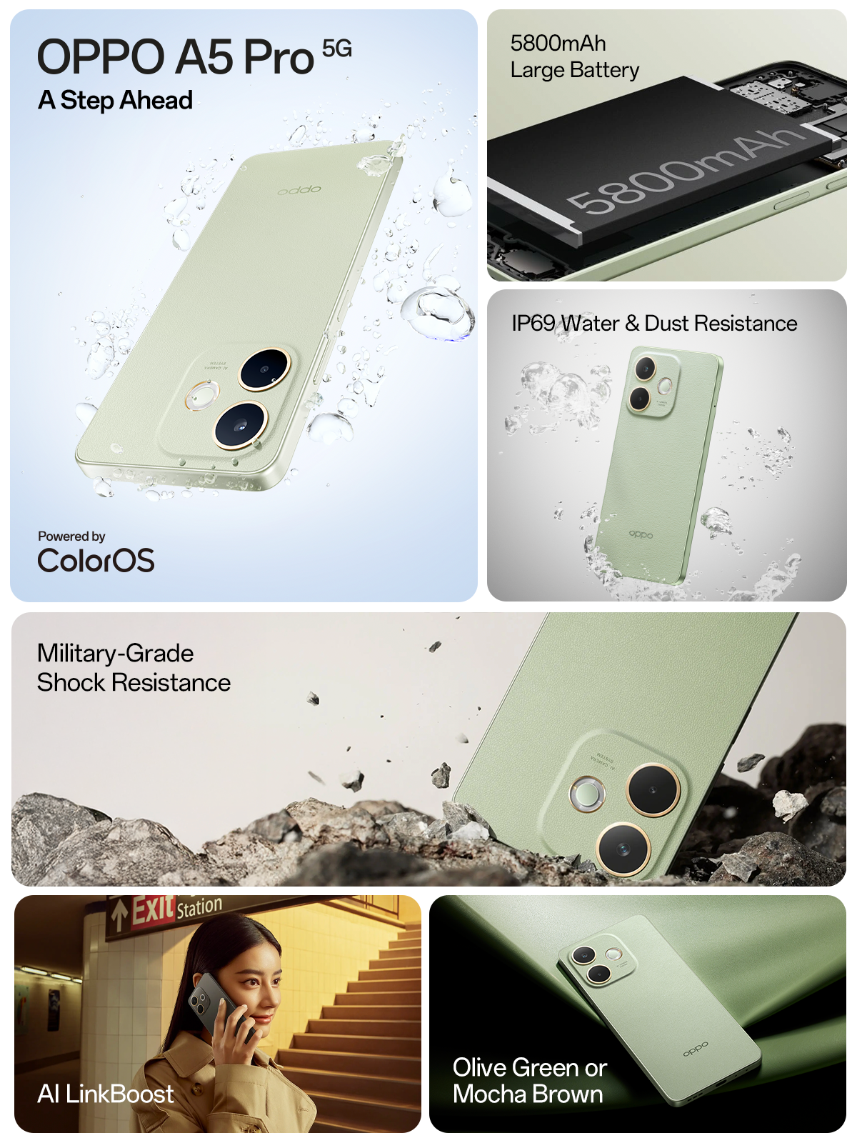 Stay unstoppable with the OPPO A5 Pro 5G, designed for durability and endurance. With IP69 Water & Dust Resistance, it stands strong against the elements, while the massive 5800mAh battery keeps you powered all day. Need a quick boost? 45W SUPERVOOC™ fast charging gets you back to full speed in no time. Plus, AI LinkBoost 2.0 ensures ultra-smooth connectivity wherever you go. Reliable, resilient, and ready for anything, this is the OPPO A5 Pro 5G.