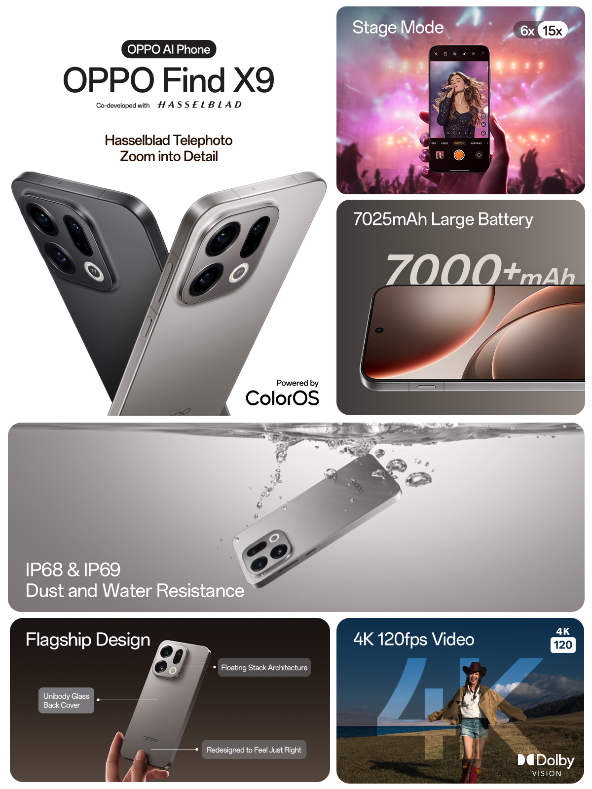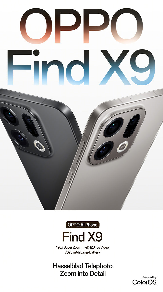The OPPO Find X9 redefines mobile photography and performance. Capture breathtaking detail with 120x Super Zoom and a Quad Camera System for lifelike shots in any lighting. Equipped with a 7025mAh battery and 80W SUPERVOOC™ fast charging, you’ll recharge to 100% in about an hour. Record in 4K 120fps video for smooth, professional-quality results that make every moment unforgettable.