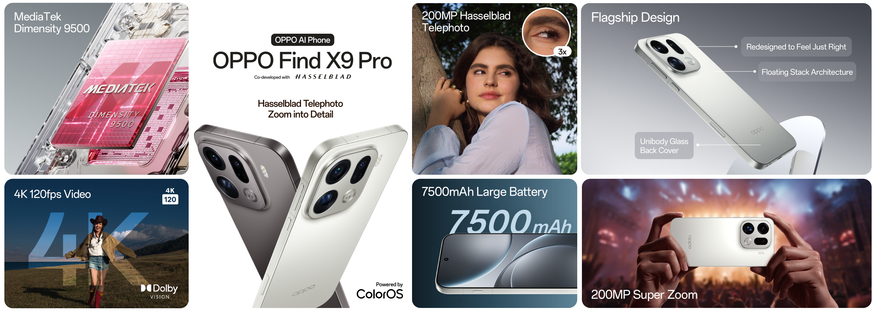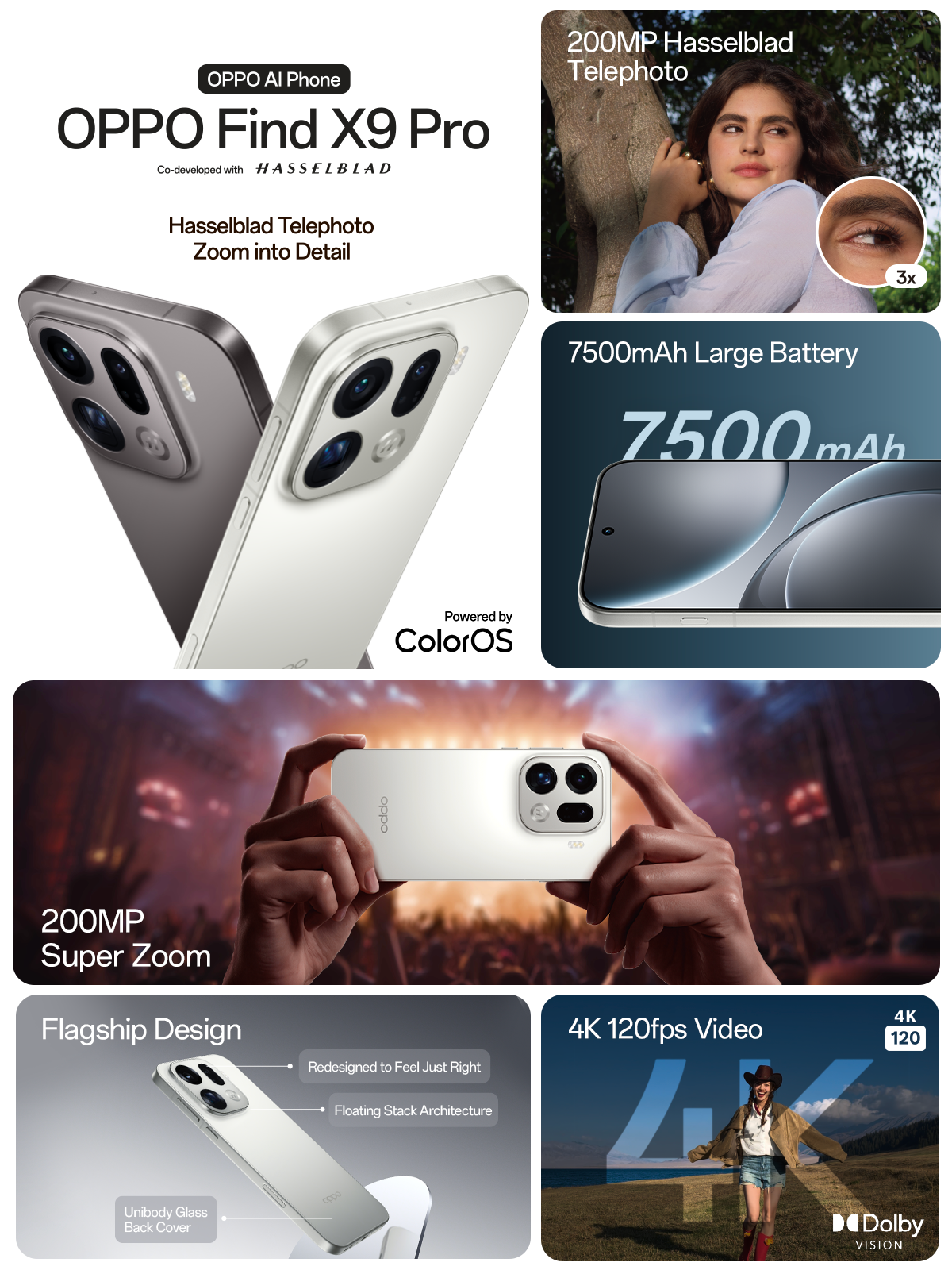 The OPPO Find X9 Pro delivers premium performance and cutting-edge photography in one device. Featuring a 200MP Hasselblad Telephoto Camera, it captures incredible detail for concert, travel, and everyday shots. With five advanced cameras, you can shoot clear, vibrant photos in any light. Powered by our largest flagship battery yet, a long lasting 7500mAh battery with 80W SUPERVOOC™ flash charging, and stay powered for longer. Record your world in 4K 120fps video for smooth, professional-grade results.