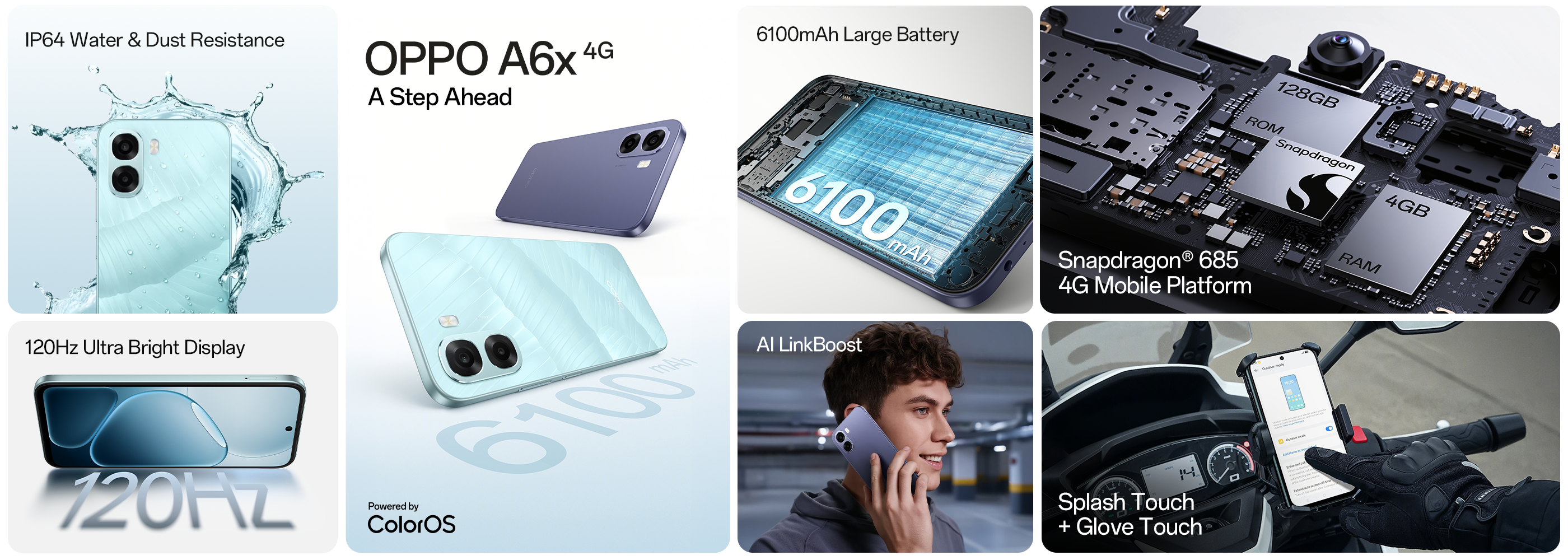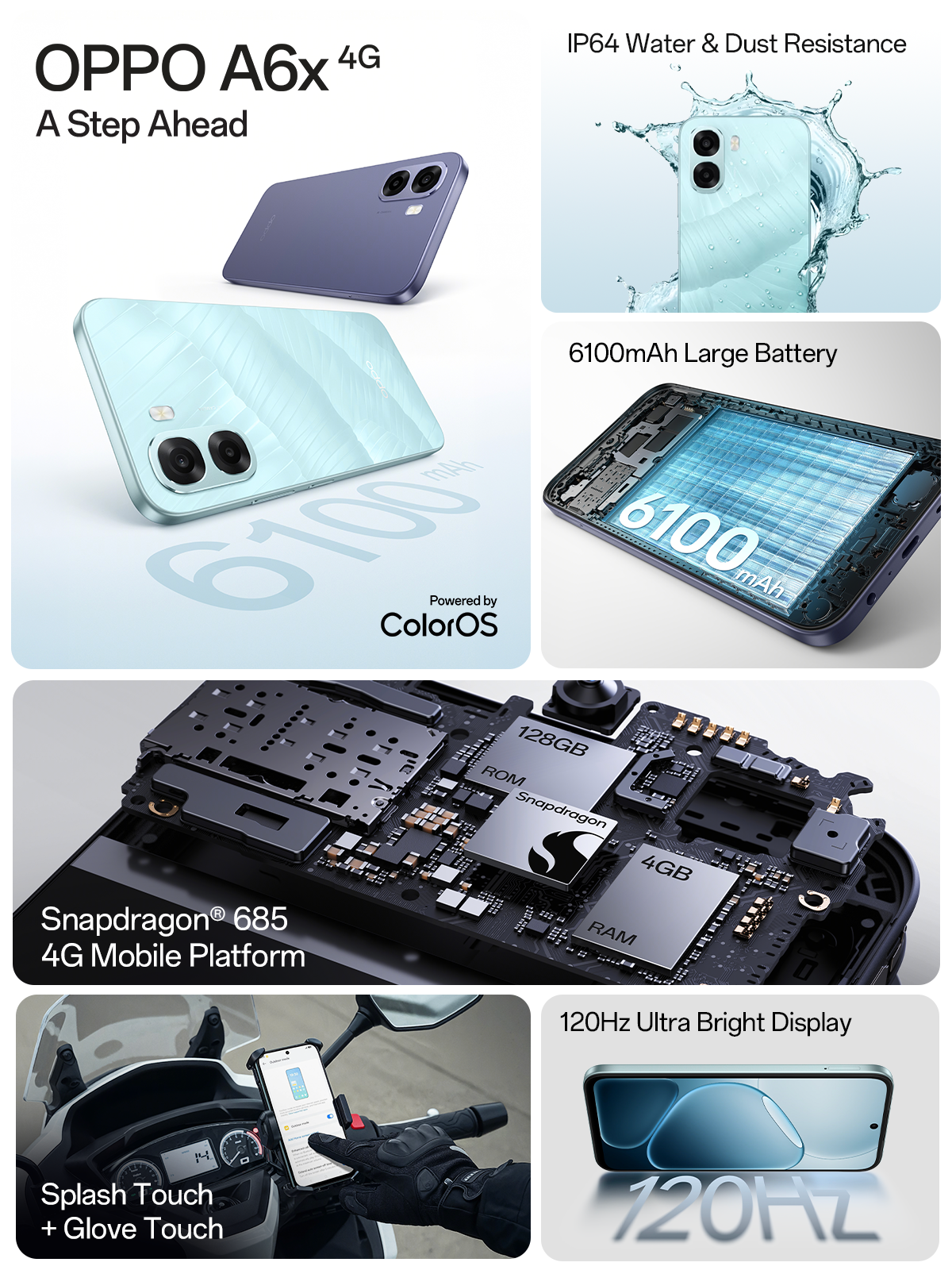 Meet the OPPO A6x, featuring an impressive 6100mAh Large Battery designed to keep you powered throughout the day. Built for reliable everyday performance, the Snapdragon 685 4G Mobile Platform delivers faster responses, stronger performance, and smoother operation for effortless use. Enjoy clear visibility even in bright sunlight with 120Hz Ultra Bright Display for clarity and smooth motion.