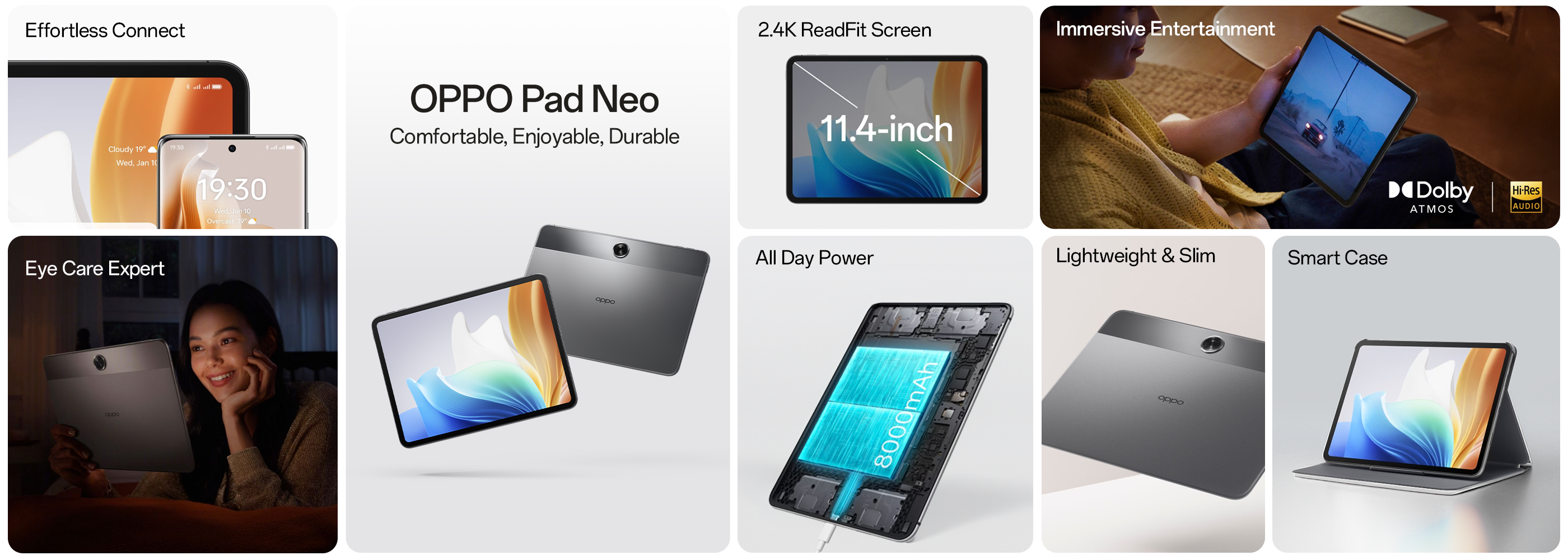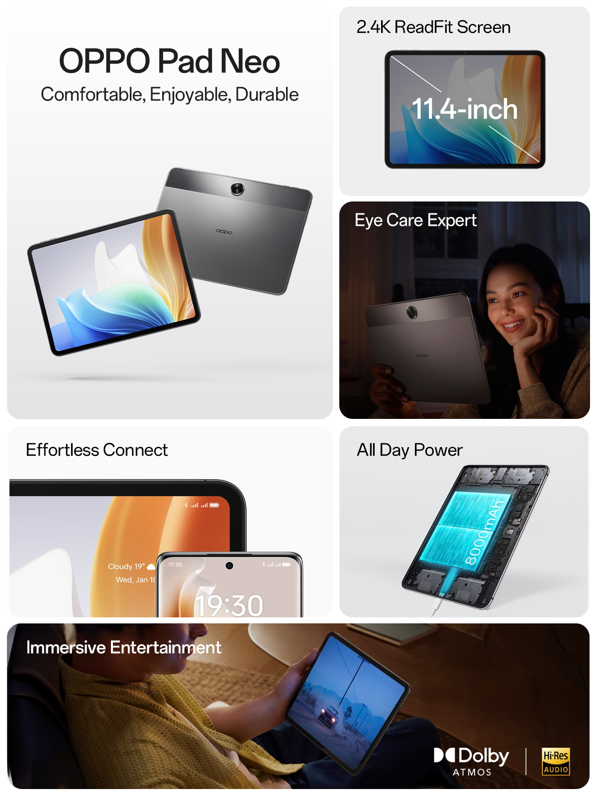 The OPPO Pad Neo's substantial 8000mAh battery enables 14.5 hours of continuous video playback. Its 33W SUPERVOOCTM flash charger wastes no time and makes sure that your tablet is always ready when you need it.