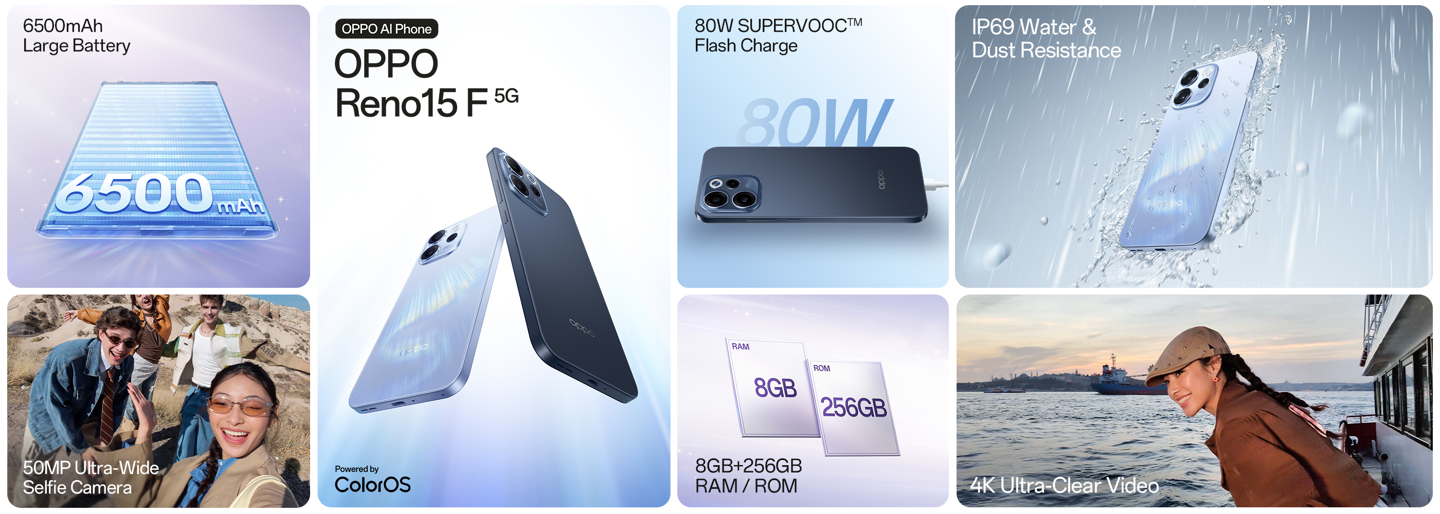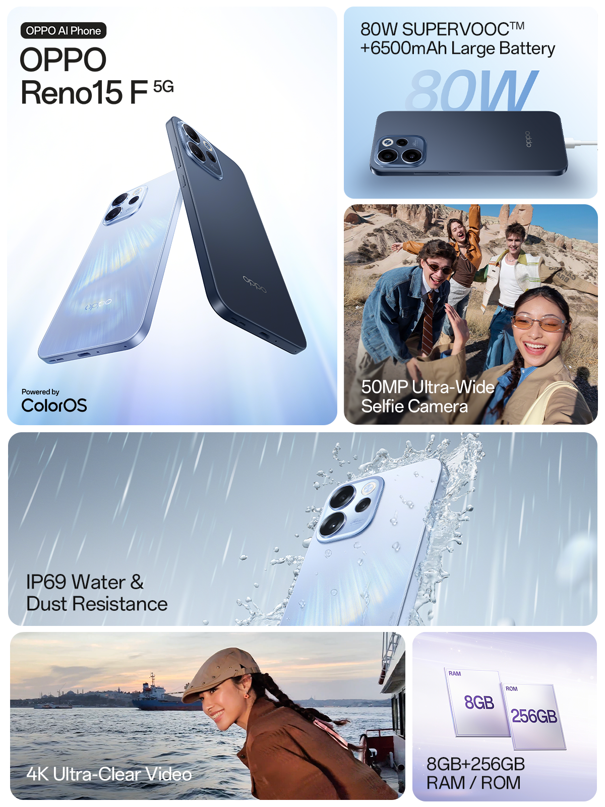 The OPPO Reno15 F delivers more for less. Capture more in every shot with the Ultra-Clear Camera System, featuring a 50MP Ultra-Wide Selfie Camera that expands your field of view by up to 90%, bringing more of life’s adventures into frame and keeping every face in focus. Bring your memories to life with 4K Ultra-Clear Video, delivering footage that stays smooth, sharp and full of detail.