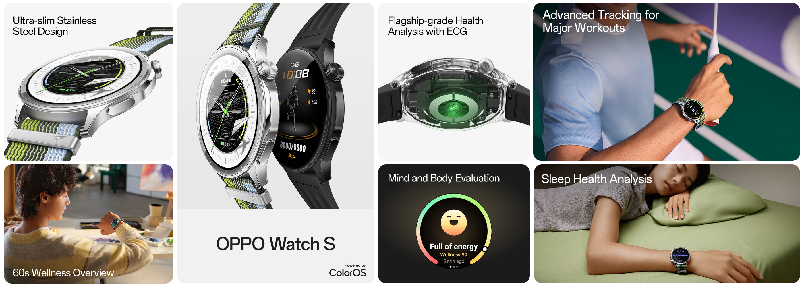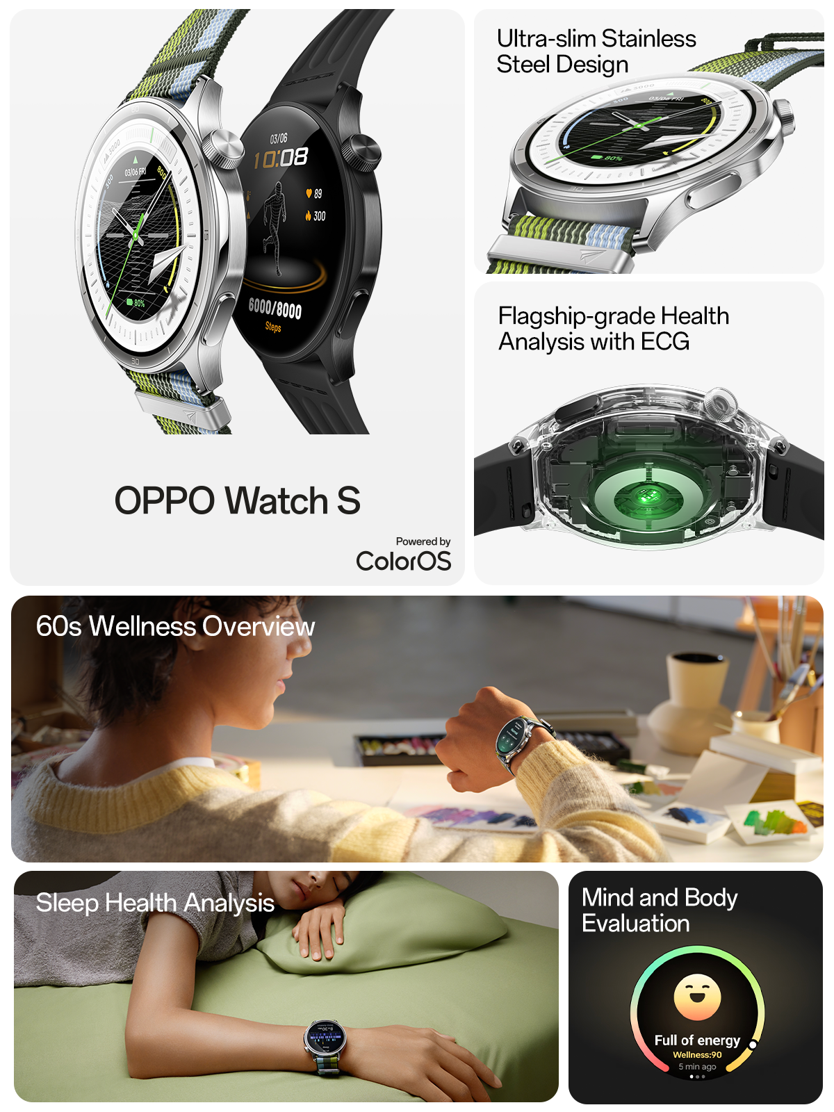 Meet the OPPO Watch S, designed for everyday comfort and smart wellness tracking in an ultra-slim 8.9mm stainless-steel design. Crafted with a durable stainless-steel case and breathable, skin-friendly straps, it’s built for all-day wear. The ultra-bright 3000-nit AMOLED display delivers clear, vivid detail so you can focus on performance, not your screen. Power through your days with up to 10 days of typical battery life and fast charging that delivers a full day of use in just 15 minutes. Stay active your way with advanced tracking across 100+ workout modes and real-time data, then check in on your wellbeing in just 60 seconds by tracking key indicators like heart rate, sleep, blood oxygen, stress and wrist temperature.